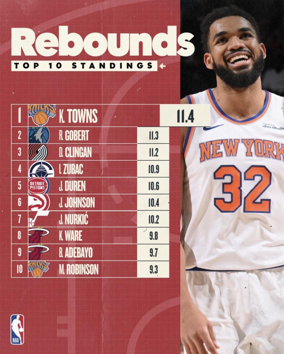 纽约:唐斯第1(11.4) + 米切尔·罗宾逊第10(9.3),说明他们的篮板产量不是靠某一位“独扛”,而是双点并行。