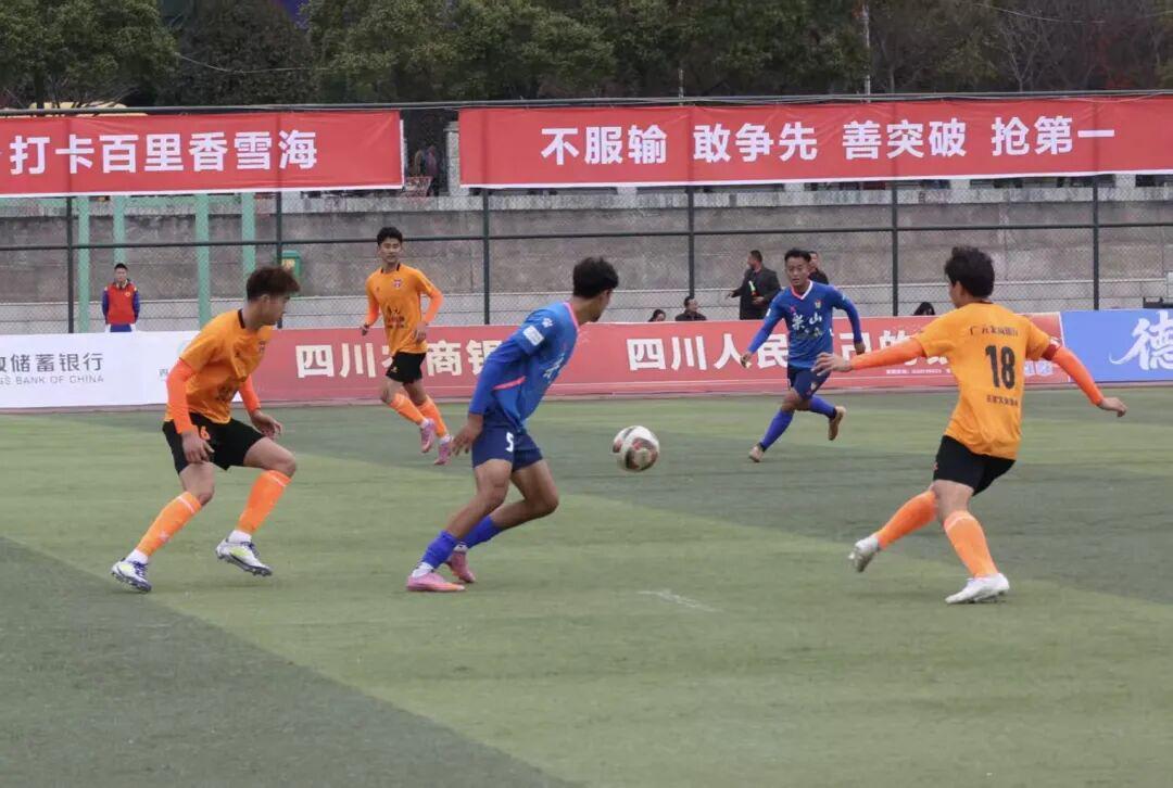 广元剑门雄关队取得了梦幻开局,上半场比赛进行到2分58秒时,广元队抓住对方门将与后卫的配合失误,在对方禁区边缘断球后,倒三角传向中路,中路跟进队员一脚推射被乐山队门将挡出,后排球员跟上补射首开纪录。