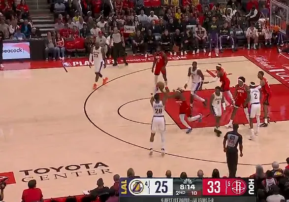 虎扑04月27日讯 NBA季后赛,湖人对阵火箭的比赛正在进行中。