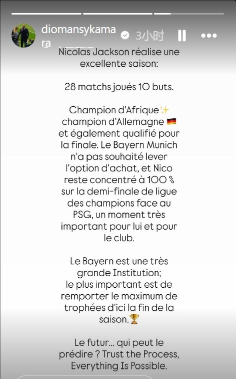 “他是非洲冠军、德甲冠军,并且同样获得了进入决赛的资格(德国杯)。拜仁慕尼黑目前并无意愿执行买断条款,但尼科(杰克逊)本人正100%专注于对阵巴黎圣日耳曼的欧冠半决赛,这对球员及其俱乐部而言都是极其重要的时刻。”